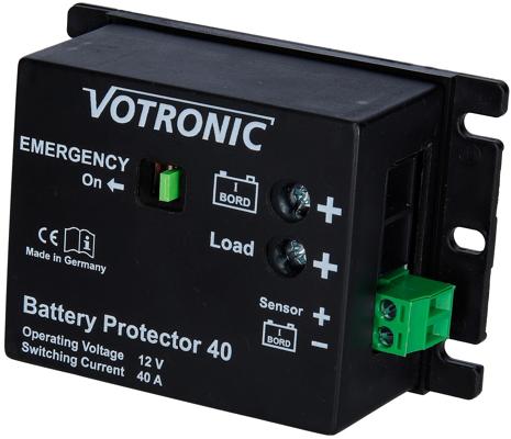 Ausrüstung vor Überspannung. Er wird zwischen Bordbatterie und Verbraucher geschaltet, ist für alle Bleibatterie-Typen geeignet und arbeitet vollautomatisch mit festen Ein- bzw. Abschaltschwellen. Von einem externen Schalter aus kann er auch als fernbedienbarer Batterie-Hauptschalter eingesetzt werden. Der Battery Protector 40 verfügt über eine NOT-EIN-Funktion, über die das Gerät jederzeit wieder eingeschaltet werden kann, auch über einen Schalter fernbedienbar. Er ist für Schaltströme bis 40 A geeignet, kann kurzzeitig bis 60 A belastet werden und ist sowohl für 12 V- als auch für 24 V-Batteriesysteme erhältlich. Ein bistabiles Leistungsrelais sorgt für äußerst geringen Eigenverbrauch kleiner 3 mA (nach DIN EN 13976). Solide Schraubklemmen bis 10 mm² Querschnitt runden das Profil ab. Die Variante „Motor“ sichert durch höhere Schaltschwellen die Startfähigkeit von Einsatzfahrzeugen mit nur einem Batteriekreis nach DIN EN 1789.