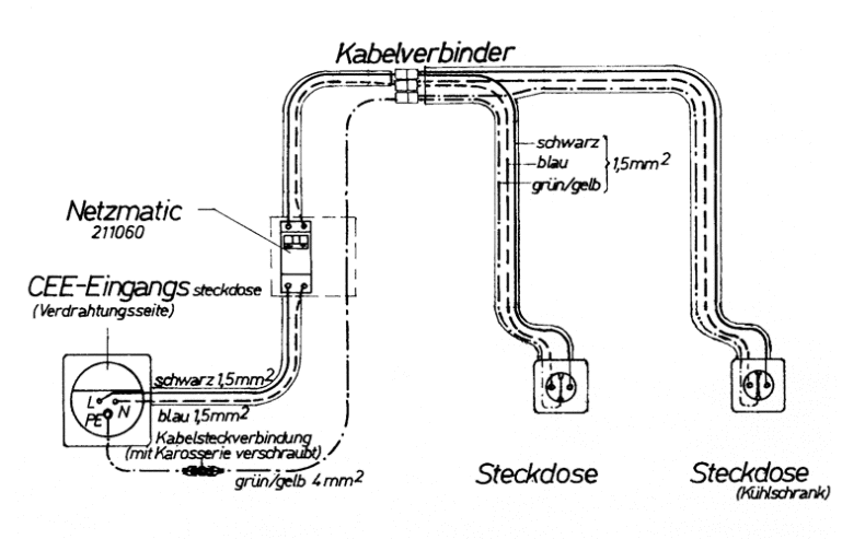 Wird benötigt, um die Karosserie mit der CEE-Einspeisesteckdose am Erdungsanschluss zu verbinden und so die Erdung für die 230-V-Verbraucher sicherzustellen.